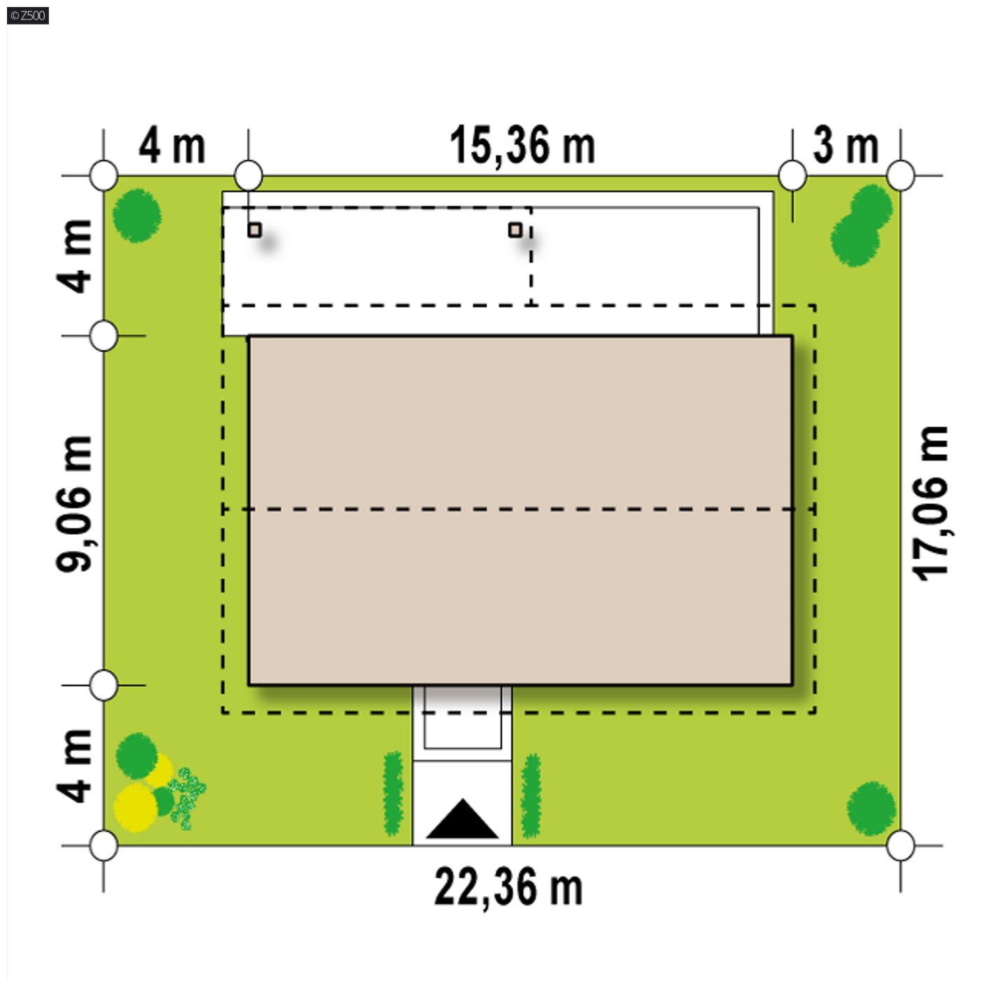 • Minimalne wymiary działki: 22,36 x 17,06 m